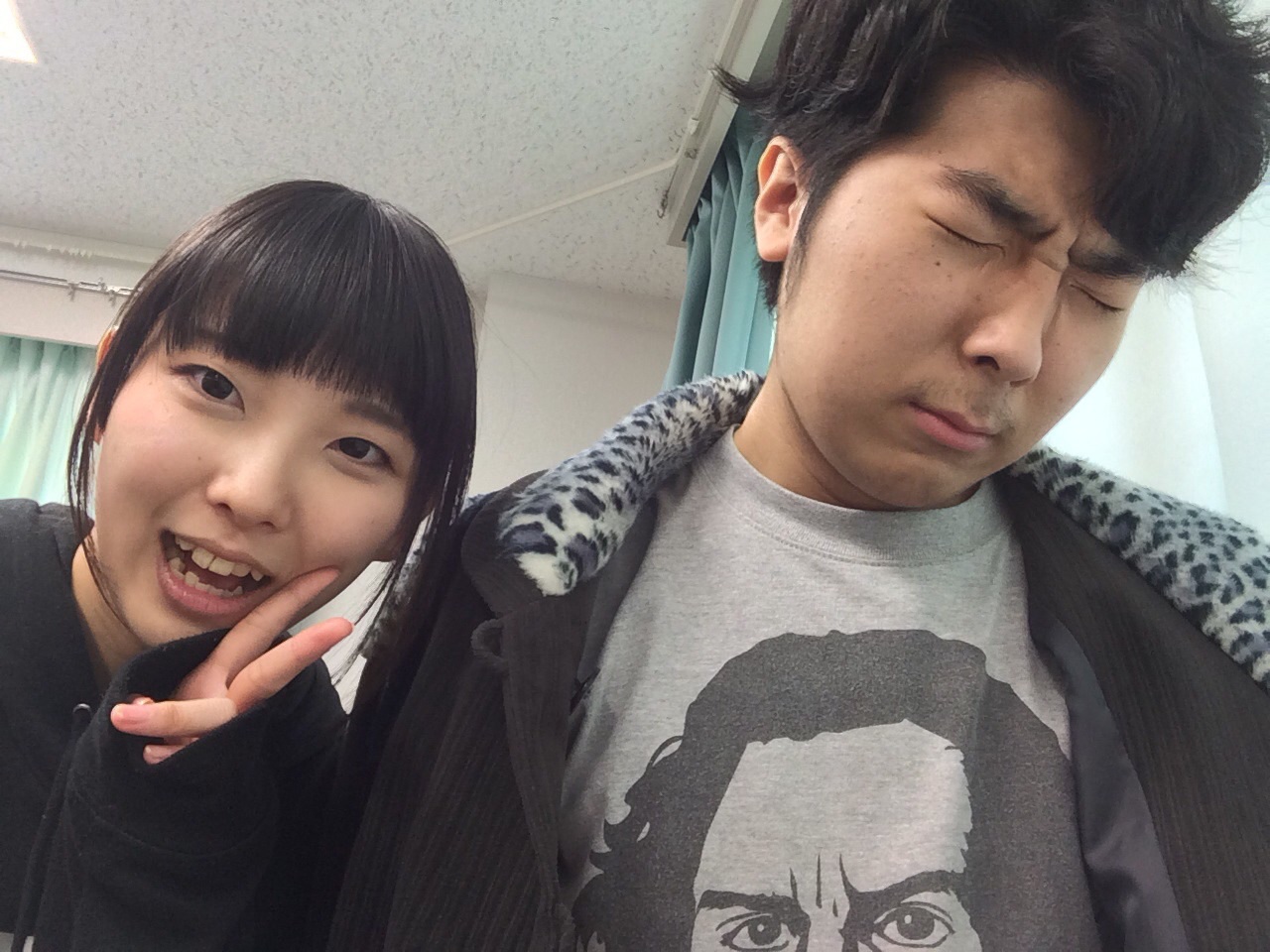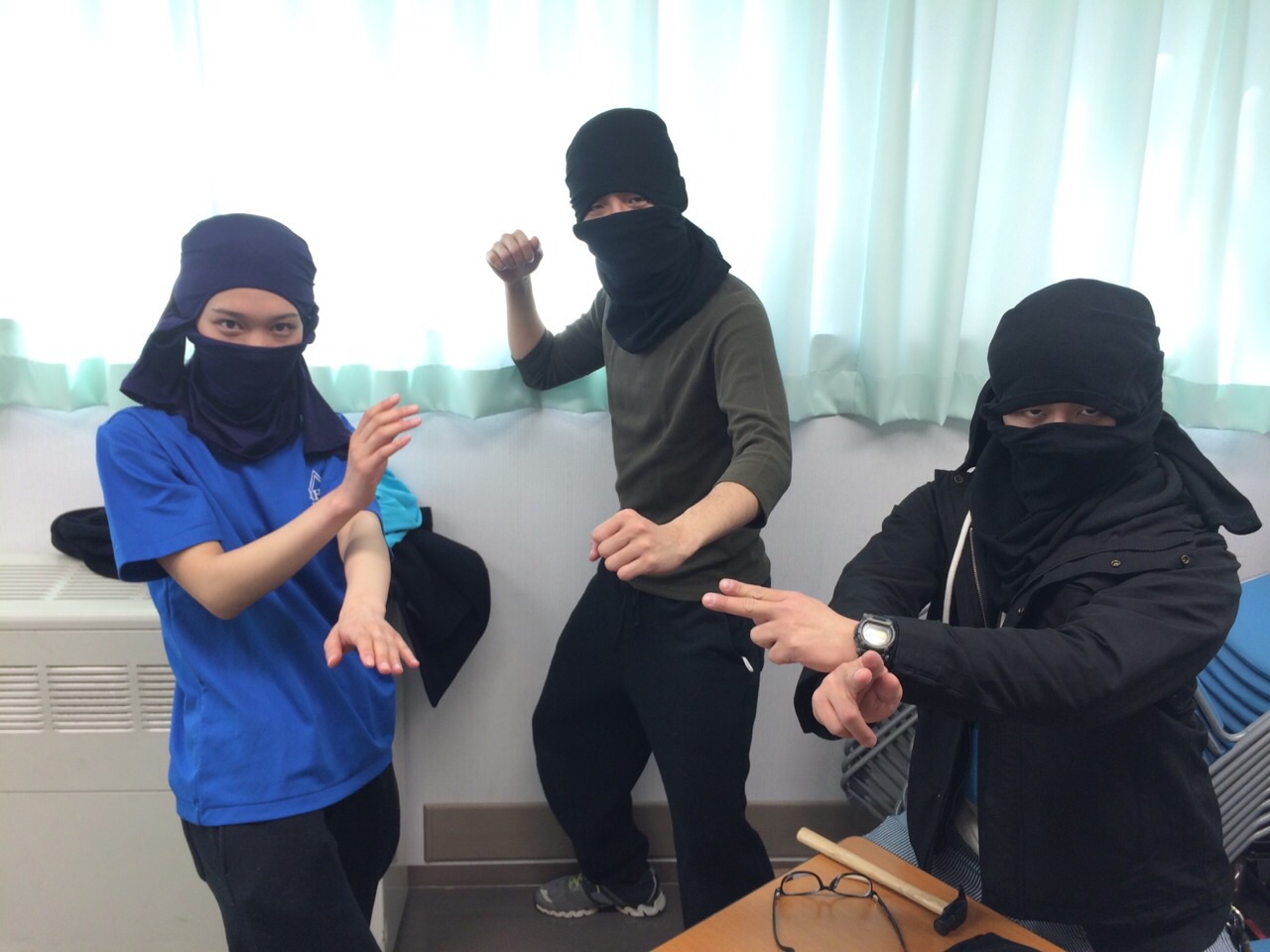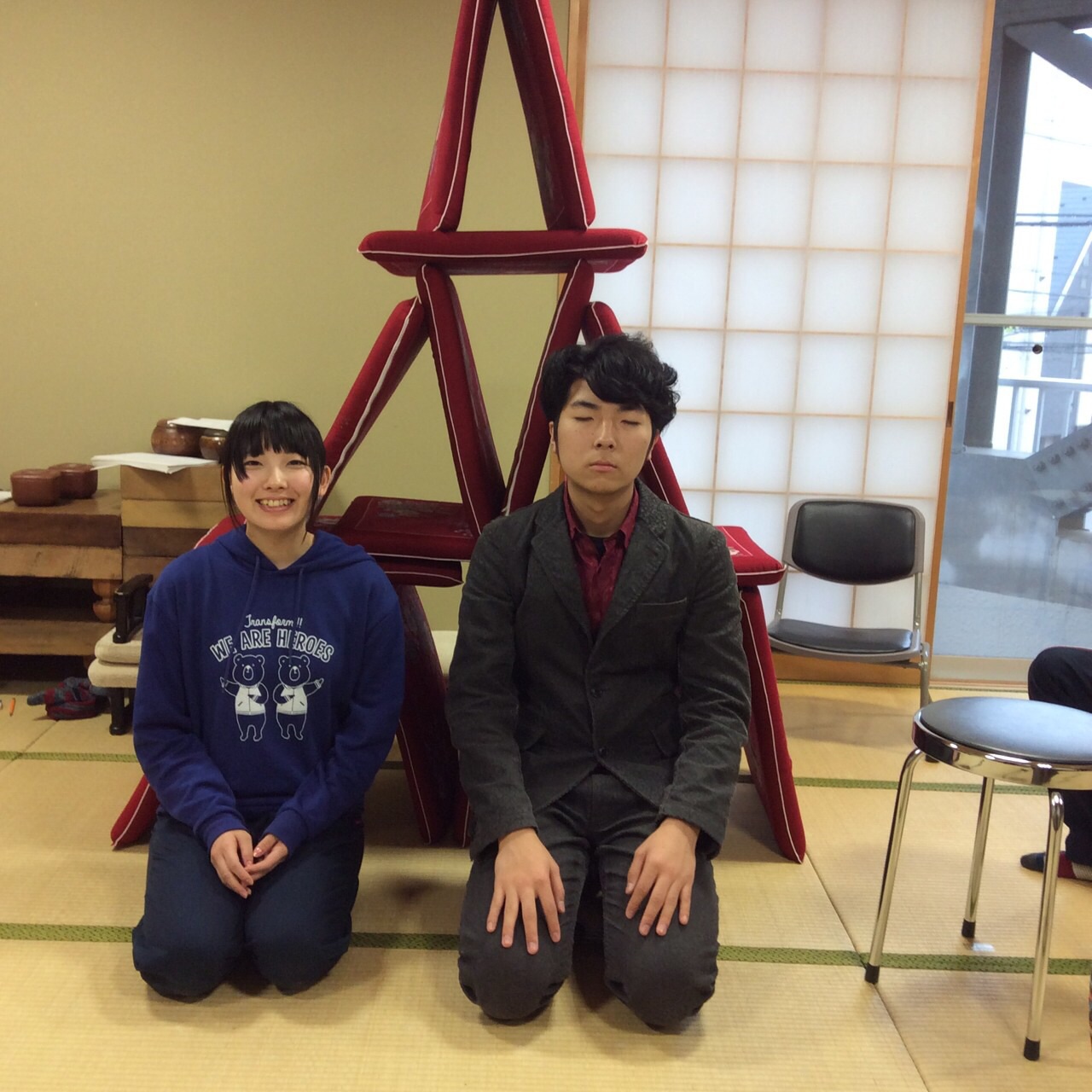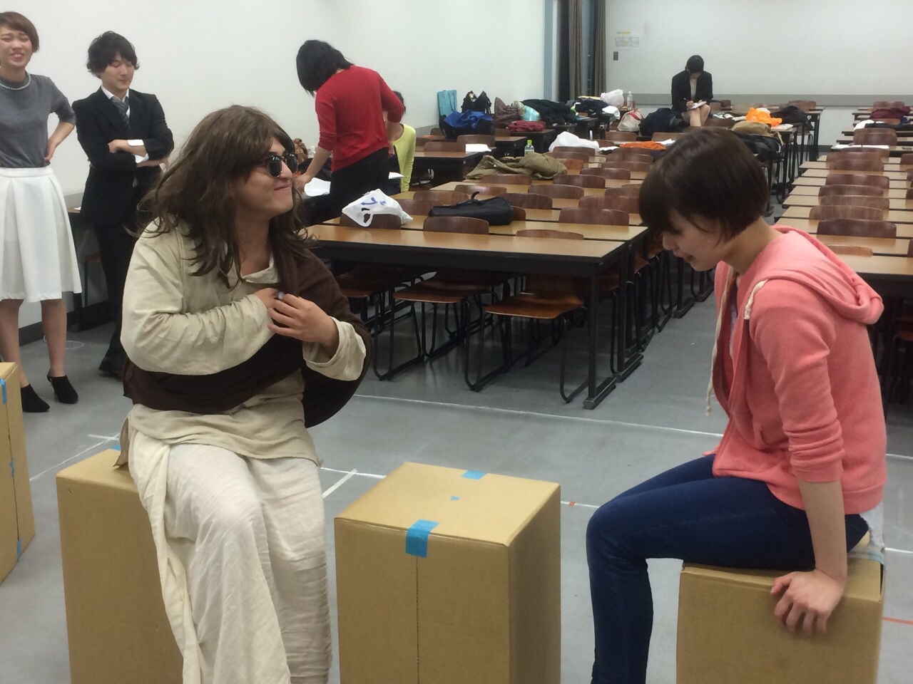 あばら骨ヒビりこさんがテロリストの格好で稽古に臨んでいます。不真面目ですね。相手役の佐々木愛さんもあきれ顔です。