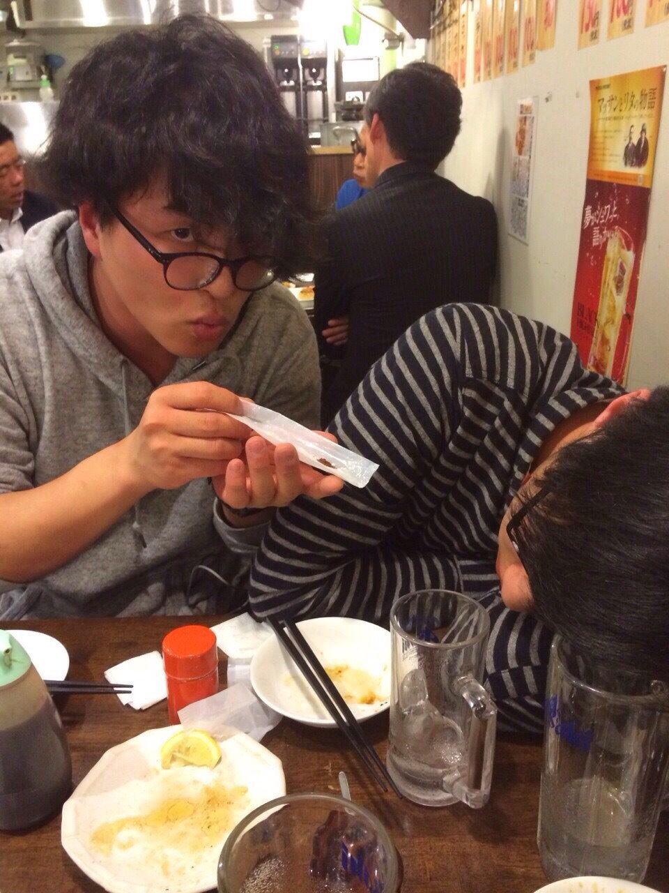 親睦会の写真です。成田天音くんがタチの悪い酔っ払いのオヤジと化し、私は現実逃避して寝てました。