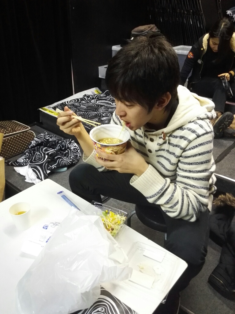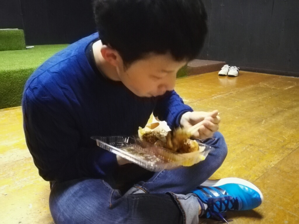 開場10分前に猛烈な勢いでたこ焼きを食べるタスクくん。